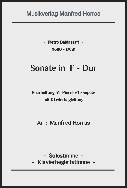 Pietro Baldassari Sonate in F - Dur für Piccolotrompete mit Klavierbegleitung. Lieferumfang: - 1 x Klavierbegleitstimme - 1 x Solostimme Info Hörbeispiel: mp3 Preis: 12,- Euro für 1 x Klavierbegleitstimme 1 x Solostimme |
